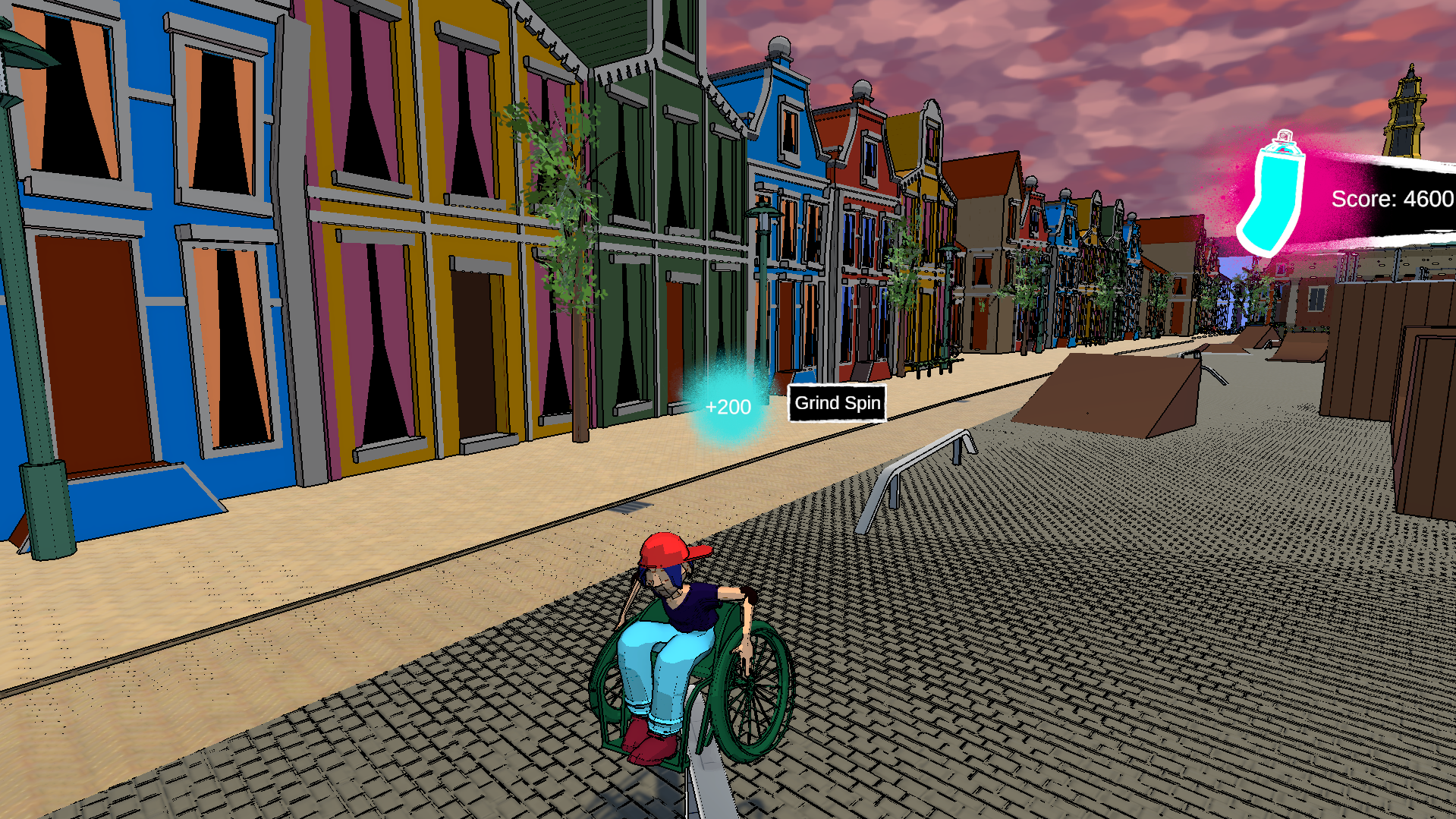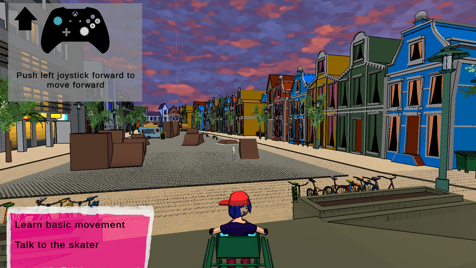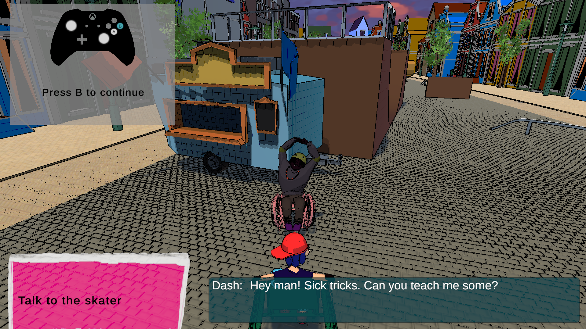 A skate park has been set up in the city center, encouraging all kinds of people to show off their amazing moves. Your goal is to learn, practice and master a variety of tricks and combinations, to raise your point score and beat the level. Ajani, a skating expert, will explain how to play, matching your chosen control scheme. The game's art style and character design is inspired by late '90s skater culture and early 2000s cartoon nostalgia.